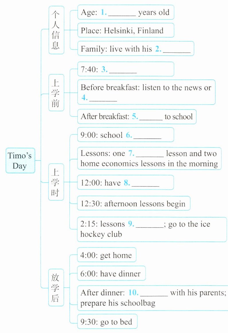 1. 13 2. parents 3. get up 4. music 5. walk 6. begins 7. Finnish 8. lunch 9. finish 10. read