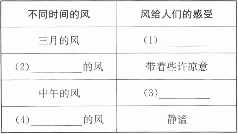 8. 文章描写了不同时间的风带给人们的感受。请根据文章内容,将表格补充完整。