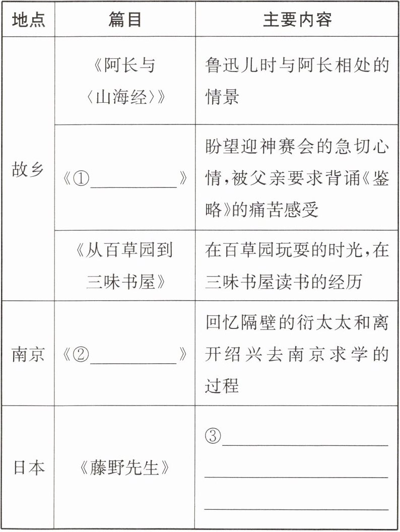 5.《朝花夕拾》中有鲁迅从幼年到青年时期的成长轨迹,请你根据地点的转换,完成下面的表格。