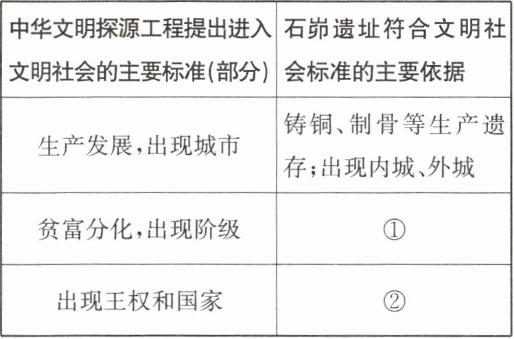 材料三 陕西榆林的石峁遗址距今4000多年,面积逾400万平方米。石砌的内城和外城拱卫着一块有城墙的台地,这是石峁遗址的核心区域,已具备了早期“宫城”的性质。石砌的墙垣不仅是防御设施,还具有神权或王权的象征意义。这里还发现了铸铜、制骨等早期“核心技术”的生产遗存。遗址中的墓葬分四类,规模由大到小,随葬品由多到少,可能代表了不同阶层的人群。