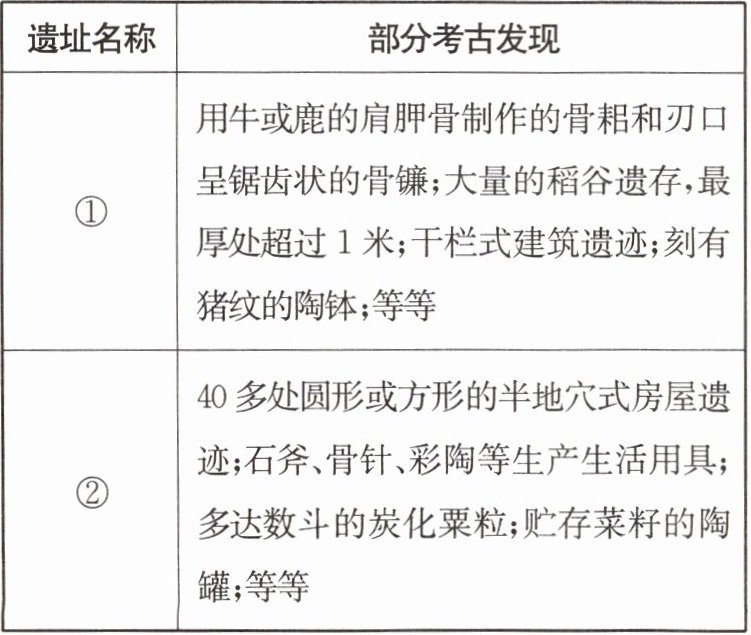 (2)①河姆渡遗址;②半坡遗址。共同点:从事原始农业;使用磨制石器;建造房屋定居;制作陶器。