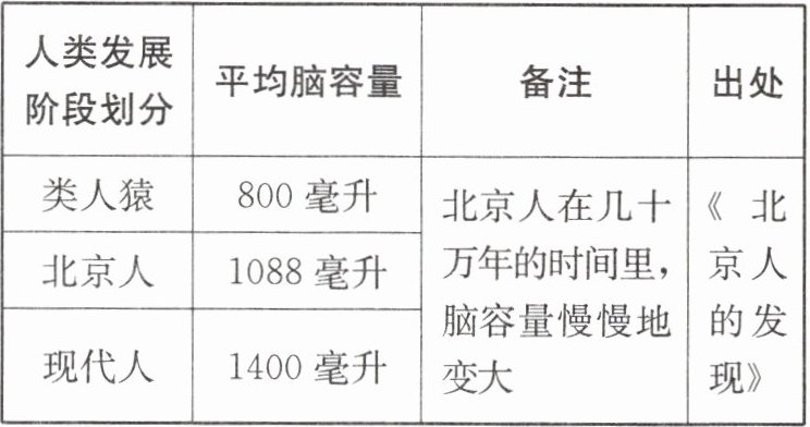 |类人猿|800毫升|北京人在几十万年的时间里,脑容量慢慢地变大|《北京人的发现》|