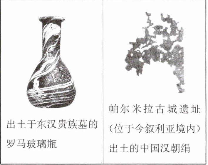 (3)从出土于东汉贵族墓的罗马玻璃瓶可知,当时丝绸之路促进了中国与罗马之间的贸易往来,罗马的玻璃制品传入中国;从帕尔米拉古城遗址出土的中国汉朝绢可知,中国的丝绸等商品通过丝绸之路远销到今叙利亚地区,体现了丝绸之路在中外经济文化交流中的重要作用。