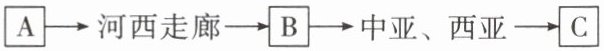 (1)A:长安;B:今新疆地区;C:欧洲(大秦)。
