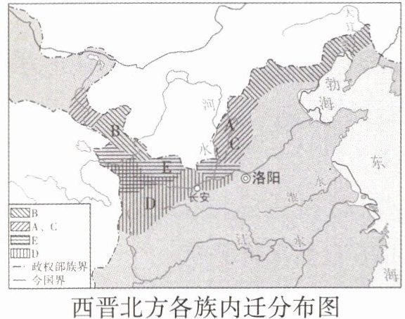 (2)民族名称:A:鲜卑;B:羌;C:匈奴;D:氐;E:羯。分布地区:中原地区(或黄河流域)。影响:促进了北方民族大交融;推动了当地经济文化的发展;也为中华民族的发展注入了新的活力。