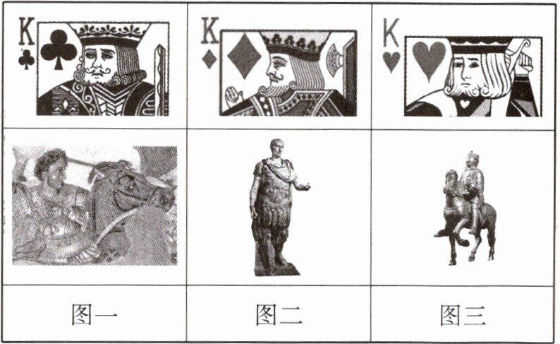 图二是方块 K,人物是凯撒,他是罗马共和国末期杰出的军事统帅、政治家。他率军占领罗马,结束罗马共和国的奴隶制危机,还对外扩张,奠定了罗马帝国的基础。