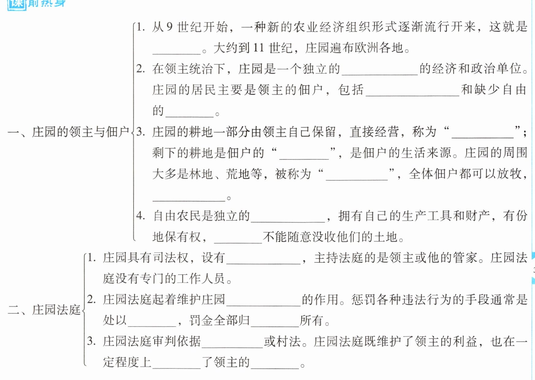 3. 庄园的耕地一部分由领主自己保留,直接经营,称为“______”;剩下的耕地是佃户的“______”,是佃户的生活来源。庄园的周围大多是林地、荒地等,被称为“______”,全体佃户都可以放牧,______。