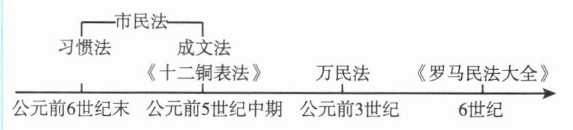 【点拨】根据所学知识可知,罗马法经历了从习惯法到成文法,从市民法到万民法,最终汇编成《罗马民法大全》的发展完善过程,所以A项正确。