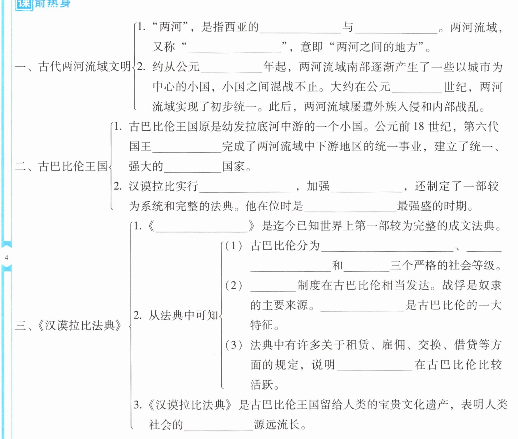 2. 约从公元前______年起,两河流域南部逐渐产生了一些以城市为中心的小国,小国之间混战不止。大约在公元前______世纪,两河流域实现了初步统一。此后,两河流域屡遭外族入侵和内部战乱。