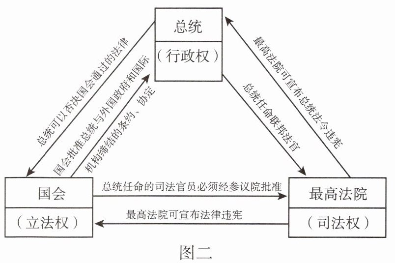 美国则确立了三权分立的共和制。1787年宪法规定,总统掌握行政权,可否决国会通过的法律;国会拥有立法权,能批准总统的条约和司法官员任命;最高法院掌握司法权,可宣布总统法令和法律违宪(图二)。三者相互制衡,避免了专制独裁。这一体制是美国独立战争后,为解决邦联制的弊端而确立的,体现了孟德斯鸠的分权学说,保障了资产阶级民主,推动了美国资本主义的发展。