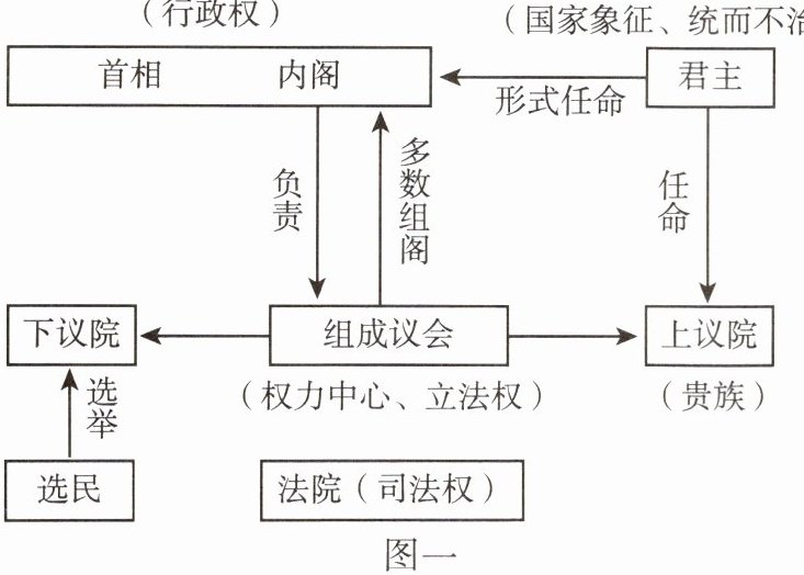 英国君主立宪制下,君主是国家象征,统而不治,仅形式上任命首相和内阁(图一)。议会是权力中心,拥有立法权,由上议院(贵族组成,君主任命)和下议院(选民选举产生)组成;首相和内阁掌握行政权,由议会多数党组成,并对下议院负责(图一)。这一体制源于1688年“光荣革命”后,1689年《权利法案》的颁布限制了王权,议会权力扩大,逐渐形成责任内阁制,为英国资本主义发展提供了稳定的政治环境。