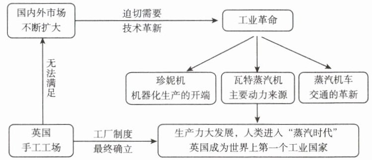论述:18世纪中期,英国通过殖民扩张和海外贸易,国内外市场不断扩大,商品需求量激增。但当时的手工工场生产效率低下,无法满足日益增长的市场需求,迫切需要生产技术的革新(材料中“国内外市场不断扩大→迫切需要技术革新”)。为提高生产效率,哈格里夫斯发明珍妮机,标志着工业革命的开始,机器化生产取代手工劳动,纺纱效率大幅提升;阿克莱特随后发明水力纺纱机,建立了第一个水力纺纱厂。随着市场的进一步扩大,对动力的需求日益迫切,瓦特改良蒸汽机,为工业生产提供了强大而稳定的动力,彻底改变了生产面貌,使工厂可以摆脱自然条件限制,在城市集中建立,促进了工厂制度的确立(材料中“瓦特蒸汽机→主要动力来源”“工厂制度最终确立”)。蒸汽机车的发明则解决了商品运输难题,扩大了市场辐射范围。最终,工业革命使英国生产力大幅提升,成为世界上第一个工业国家(材料中“英国成为世界上第一个工业国家”)。