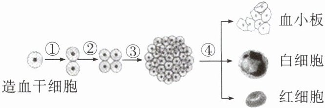 8. 骨髓中的造血干细胞通过细胞分裂和细胞分化不断产生新的血细胞,如图所示。图中表示细胞分化的是(