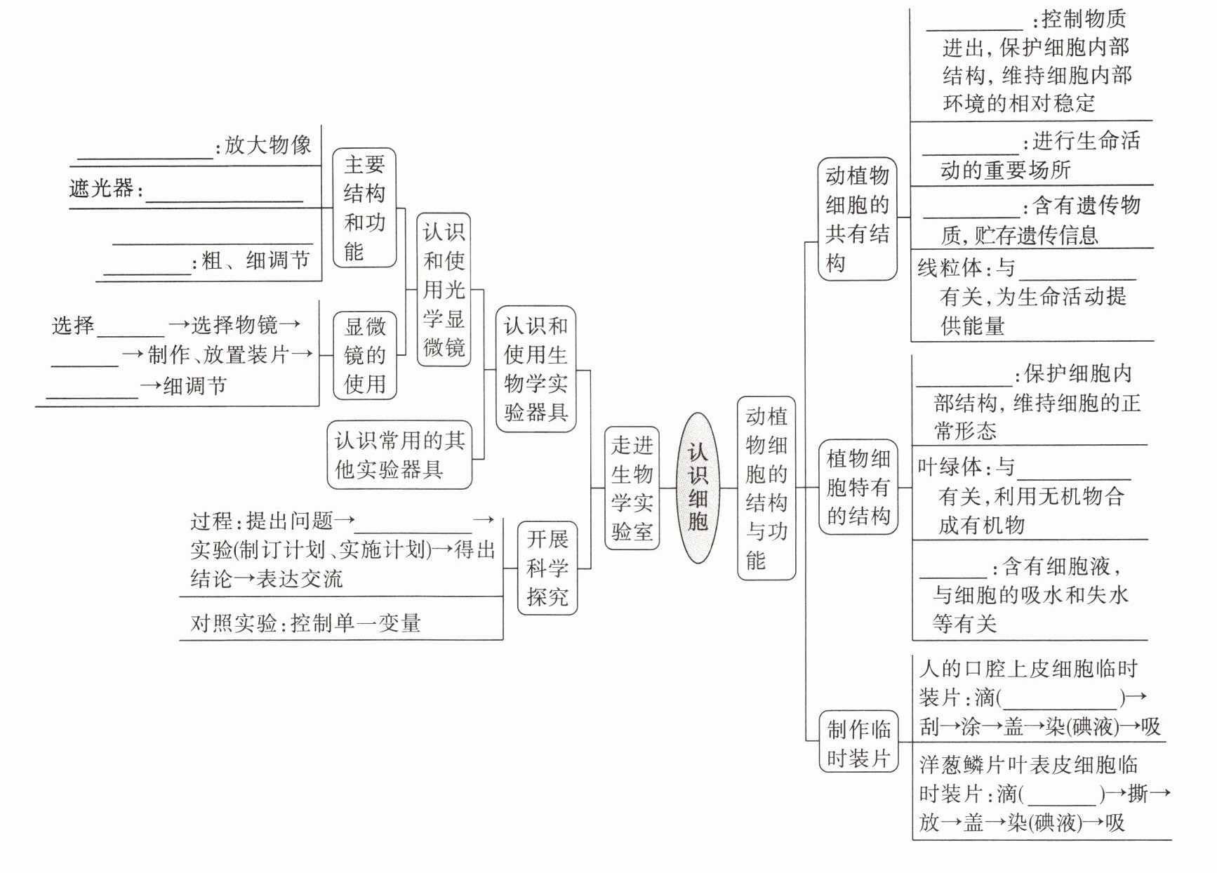 目镜和物镜;调节光线强弱;粗、细准焦螺旋;目镜;对光;粗调节;作出假设;细胞膜;细胞质;细胞核;呼吸作用;细胞壁;光合作用;液泡;生理盐水;清水