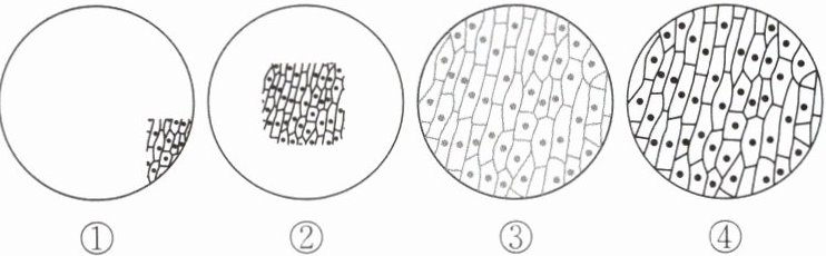 9. 如图是用显微镜观察洋葱鳞片叶表皮细胞临时装片时,看到的几个视野。要使图像从视野①变为视野④,下列操作正确的是(