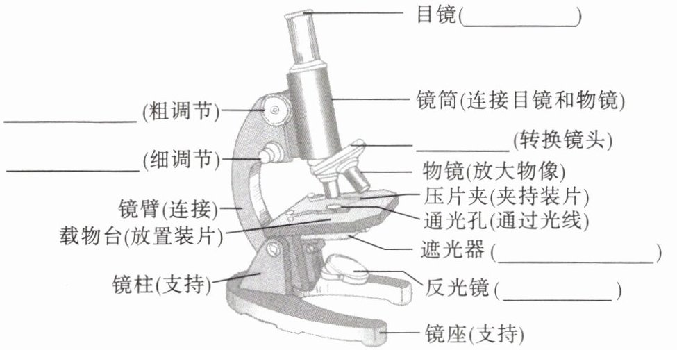 放大物像;粗准焦螺旋;细准焦螺旋;转换器;调节光线强弱;反射光线;乘积