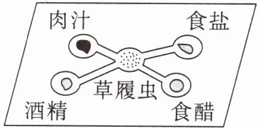 (2)对于草履虫来说,肉汁是有利刺激,而食盐、酒精、食醋是不利刺激。在题图所示实验一段时间后,草履虫最多的是滴有肉汁的区域,这说明草履虫能对环境变化产生反应(能趋向有利刺激,逃避不利刺激)。