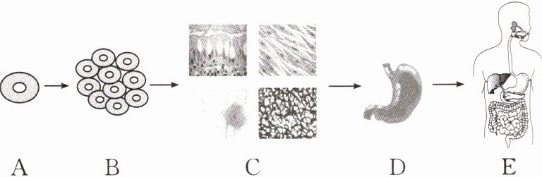5. 如图所示,A~E表示人体的不同结构层次,请据图回答问题。