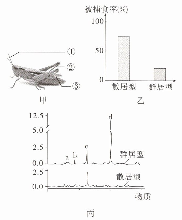 (3)科学家检测了蝗虫释放的a、b、c、d四种挥发性物质(如图丙),发现物质的含量存在差异。其中差异最显著的是
