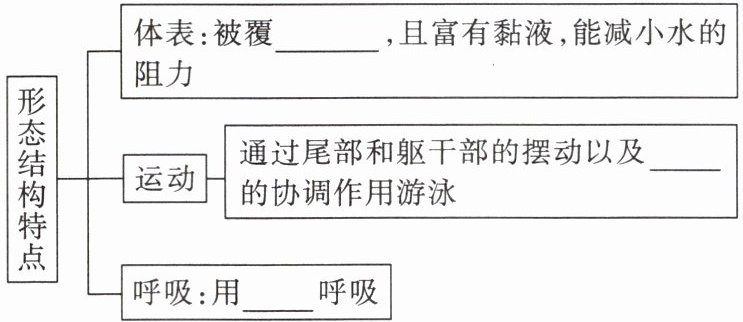 ;体表被覆鳞片且富有黏液,能减小水的阻力,用鳃
