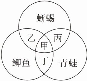 乙是鲫鱼和蜥蜴的共同特征,鲫鱼用鳃呼吸,B 错误。丙是青蛙和蜥蜴的共同特征,它们都是变温动物,C 错误。丁是鲫鱼和青蛙的共同特征,它们的卵外都没有坚硬的卵壳,D 错误。