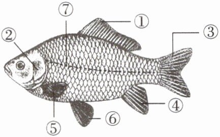6. 俗话说:“鱼儿离不开水。”某生物学兴趣小组合作探究鲫鱼适应水中生活的特征,探究实验前选择了两条大小相近的鲫鱼,放入盛有河水的鱼缸内。如图为鲫鱼的形态结构示意图。请分析并回答问题。