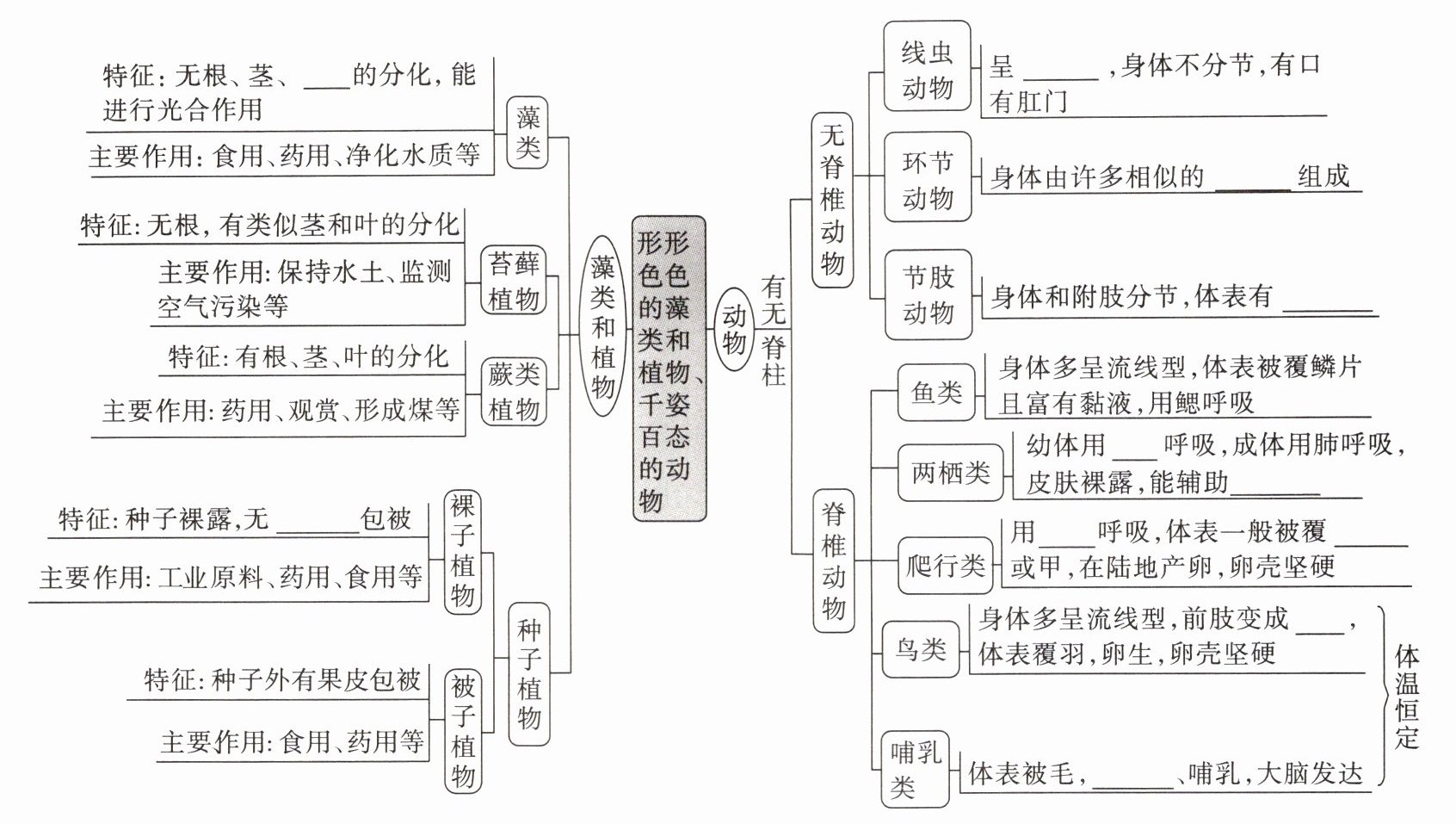 叶;果皮;圆柱形;体节;外骨骼;鳃;呼吸;肺;鳞片;翼;胎生