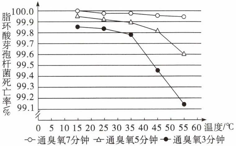 8.脂环酸芽孢杆菌能耐受巴氏消毒过程的瞬间高温,且在遇到适宜的条件后,仍可迅速生长繁殖,产生特殊气味,并导致果汁变质,是果汁生产中比较棘手的常见污染菌。科研人员尝试用臭氧杀灭这种污染菌,研究了不同条件下臭氧对脂环酸芽孢杆菌的杀菌效果,结果如图所示。请回答下列问题。