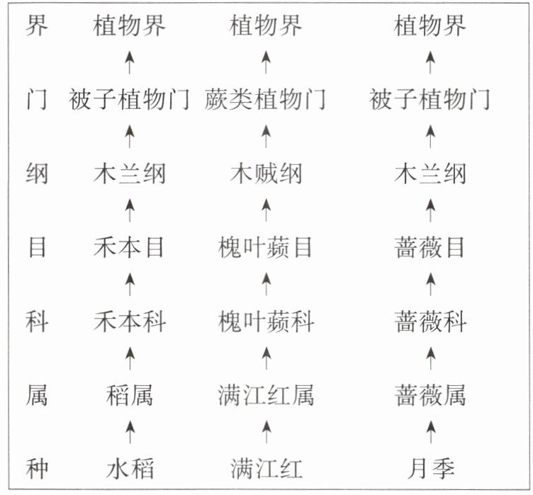 6. 下面是水稻、满江红和月季的分类等级图,请你用所学知识回答下列问题。