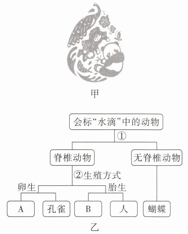 (1)某同学将会标“水滴”中的动物进行了分类,如图乙所示。①表示的分类依据是