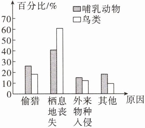 [例4]一项研究显示了某地哺乳动物和鸟类濒危或受到威胁的原因,其结果如图。下列分析错误的是(