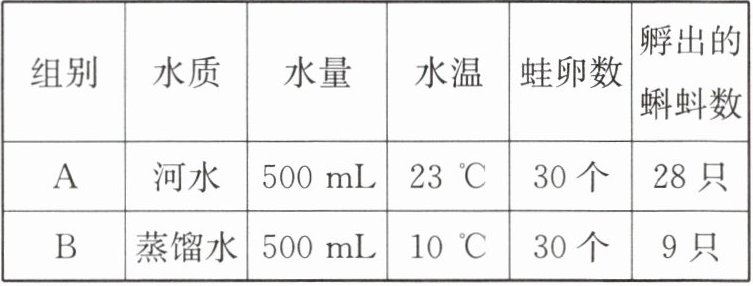 4. 某兴趣小组就“不同水质对蛙卵孵化的影响”进行探究,其实验记录如下表所示。