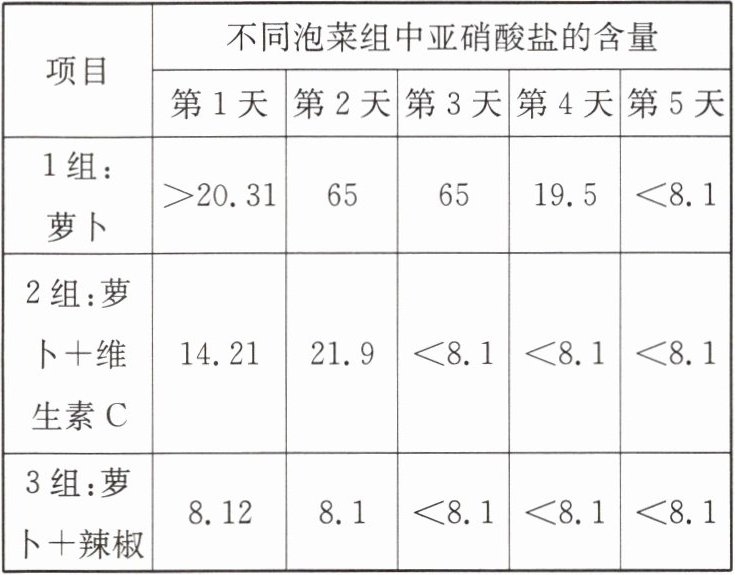 (3)学习小组的同学通过查阅资料了解到,在腌制泡菜的过程中加入一定量的维生素C能在一定程度上影响亚硝酸盐的形成。为了明确维生素C的具体效果,学习小组选取了萝卜和辣椒进一步进行探究,实验结果如下表所示。