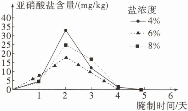 (2)不同盐浓度下,泡菜中亚硝酸盐含量均先上升后下降;且盐浓度越高,亚硝酸盐含量的峰值越低(或相同腌制时间下,盐浓度越高,亚硝酸盐含量越低)