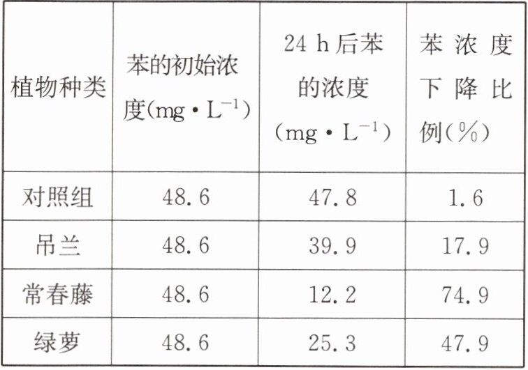 2. 苯是室内装修最主要的污染物之一。科研人员为了研究“植物是否能吸收苯”,利用密闭无色透明玻璃箱进行实验,实验条件相同且适宜。每组进行3次重复实验,并将测得的箱体内苯浓度的数据均值记入表格。下列有关叙述错误的是(