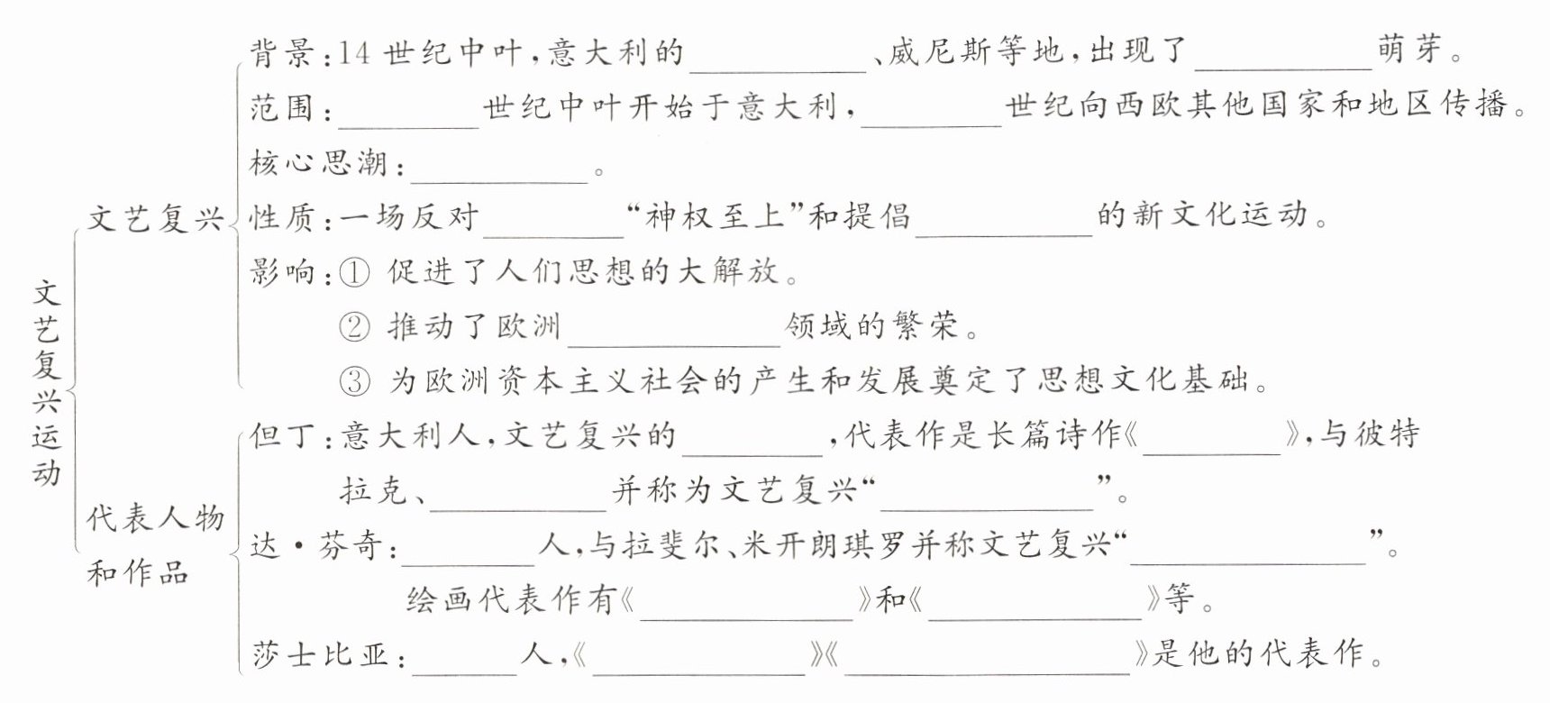 1. 佛罗伦萨;资本主义;14;15、16;人文主义;教会;人文主义;文化思想;先驱;神曲;薄伽丘;文学三杰;意大利;美术三杰;蒙娜丽莎;最后的晚餐;英国;哈姆雷特;罗密欧与朱丽叶