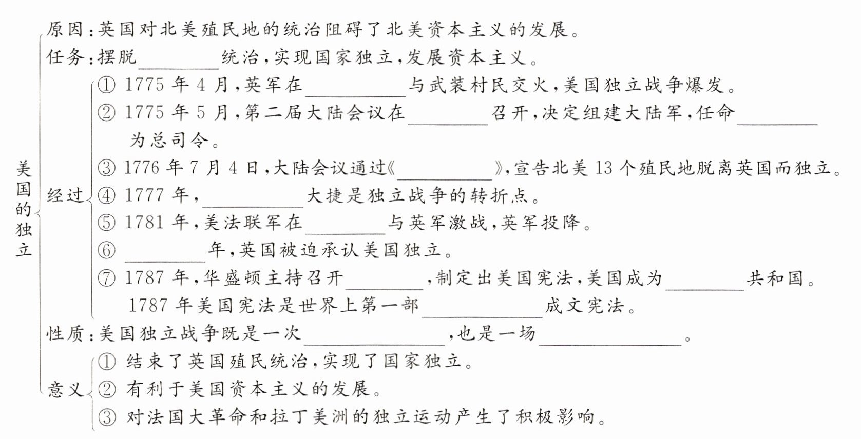 1. 英国 2. 来克星顿 3. 费城 4. 华盛顿 5. 独立宣言 6. 萨拉托加 7. 约克镇 8. 1783 9. 制宪会议 10. 联邦制 11. 资产阶级 12. 民族解放战争 13. 资产阶级革命