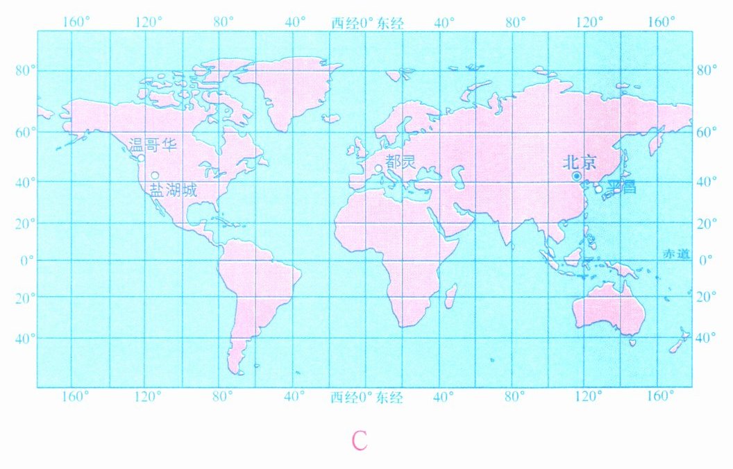 3. 图C中经线和纬线的形状是____,经纬网呈____状。