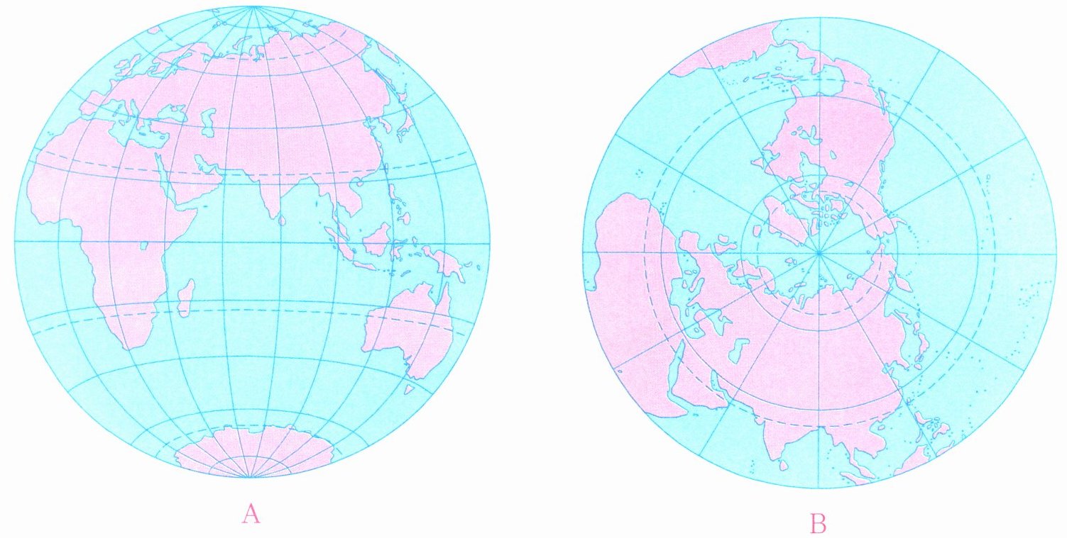 2. 图B中以____点为中心,经线的形状是____,纬线的形状是____。