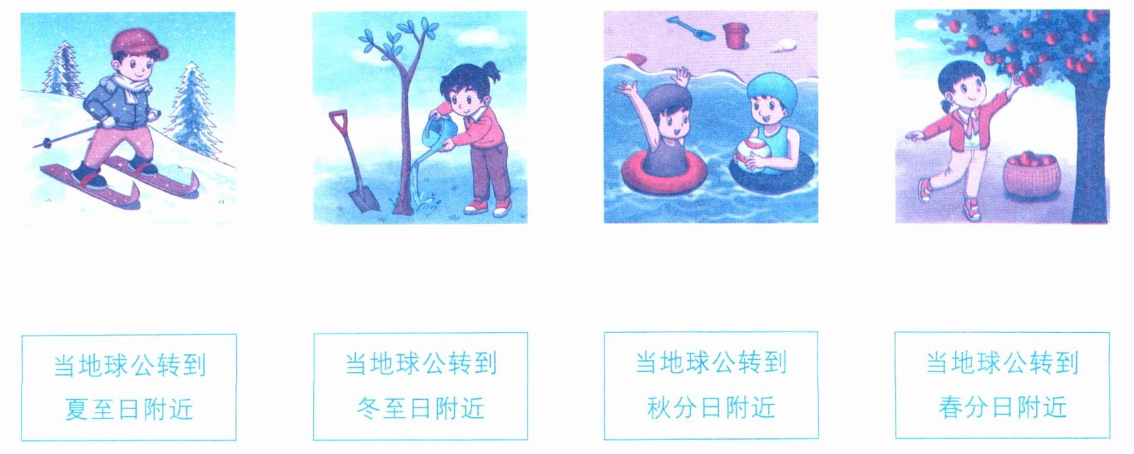 将地球公转的位置与位于北半球中纬度地区的小朋友适宜进行的活动连线。