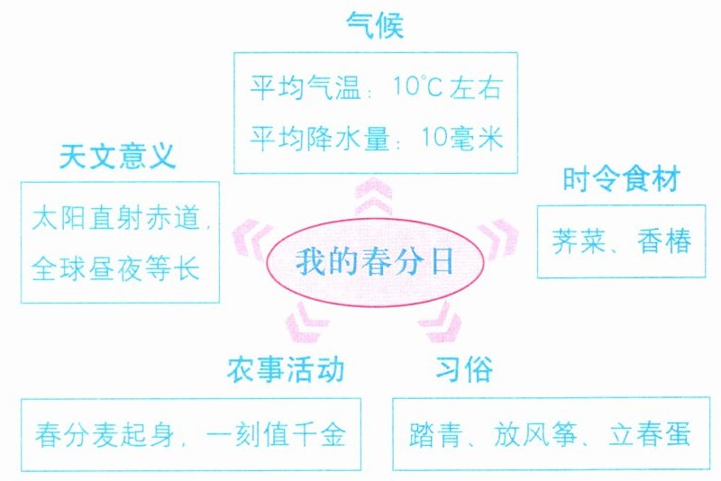 1. 制作“我的节气”思维导图。任选一个节气,从天文意义、气候、农事活动、时令食材、习俗等方面收集资料。以春分为例如下: