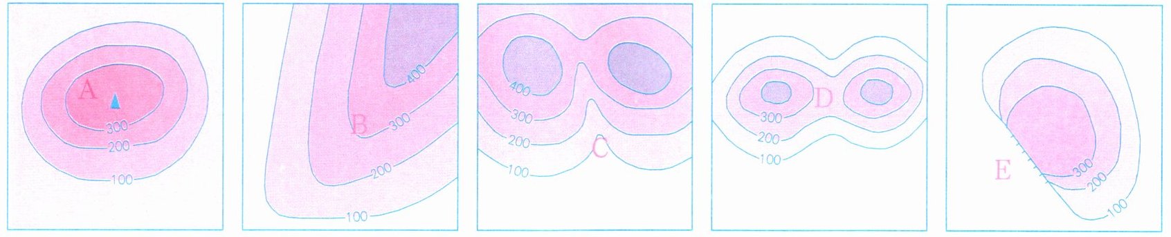 (左右上下顺序)山峰 等高线闭合,中间数值高,四周数值低 D 鞍部 山脊 等高线向低处凸出 E 陡崖 C 等高线向高处凸出