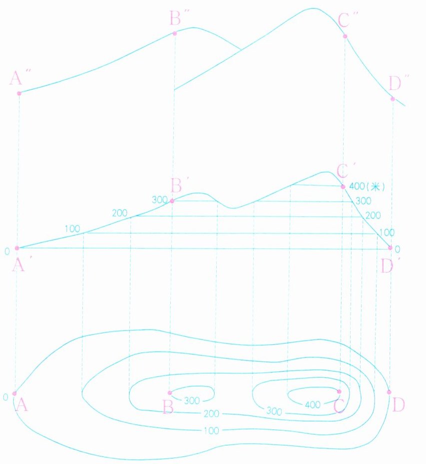 2. 将甲、丙两图对照,AB段坡度较缓,等高线______(密集/稀疏);CD段坡度较陡,等高线______(密集/稀疏)。