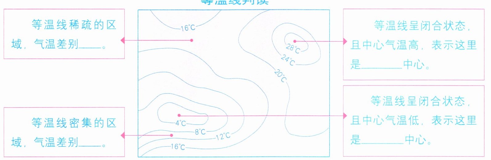 2. 读右图,高温中心是______,低温中心是______。