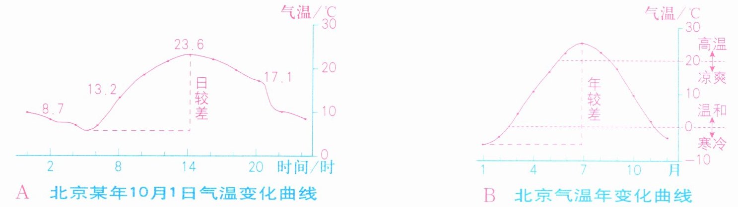 1. 读图A,一天中,北京最高气温出现在______时左右,最低气温出现在______,日较差约是______。根据2时、8时、14时和20时的气温,得出北京某年10月1日的日平均气温约是______℃。