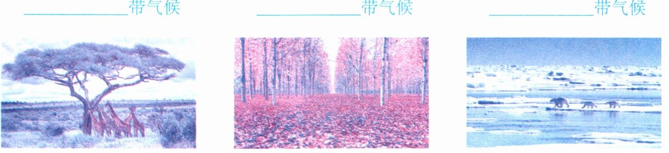 1. 世界气候分布具有一定的规律,将下列图片对应气候的热量带填在横线上。