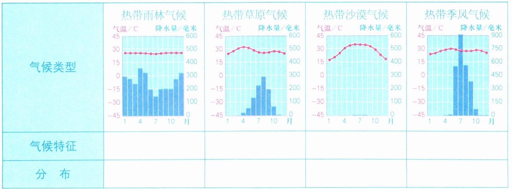 2. 读“世界主要热带气候类型分布”图,完善下表。