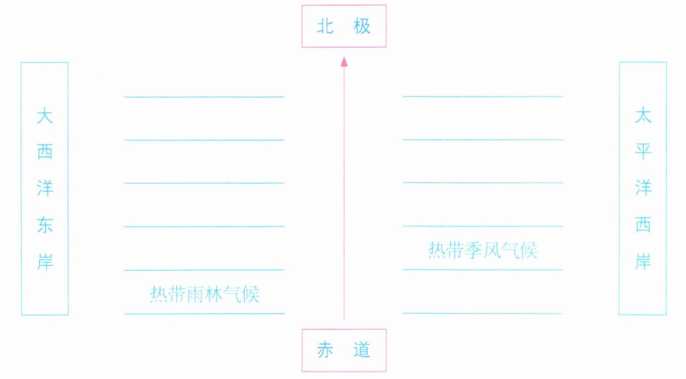 5. 找出太平洋西岸、大西洋东岸从赤道到北极依次出现的气候类型,填在下列框图中。