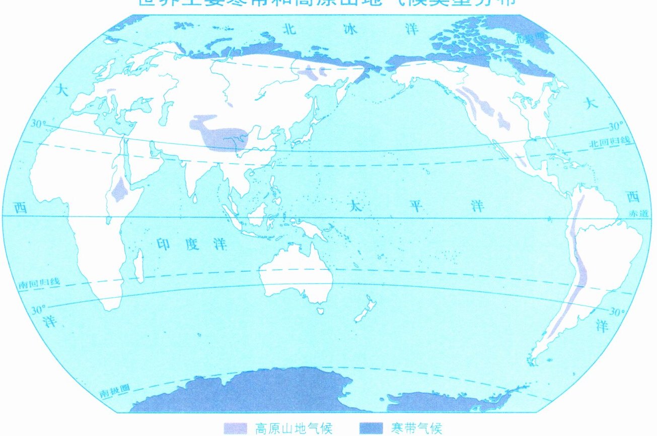 4. 读“世界主要寒带和高原山地气候类型分布”图,完善下表。
