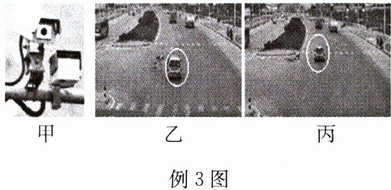 例 3 如图甲所示是现代城市很多路口安装的监控摄像头,它可以拍下违章行驶或发生交通事故时的现场照片。摄像头的镜头相当于一个______透镜。如图乙和图丙是一辆汽车经过路口时与一辆自行车相撞后被先后拍下的两张照片,由图可以看出汽车逐渐______(选填“靠近”或“远离”)摄像头。